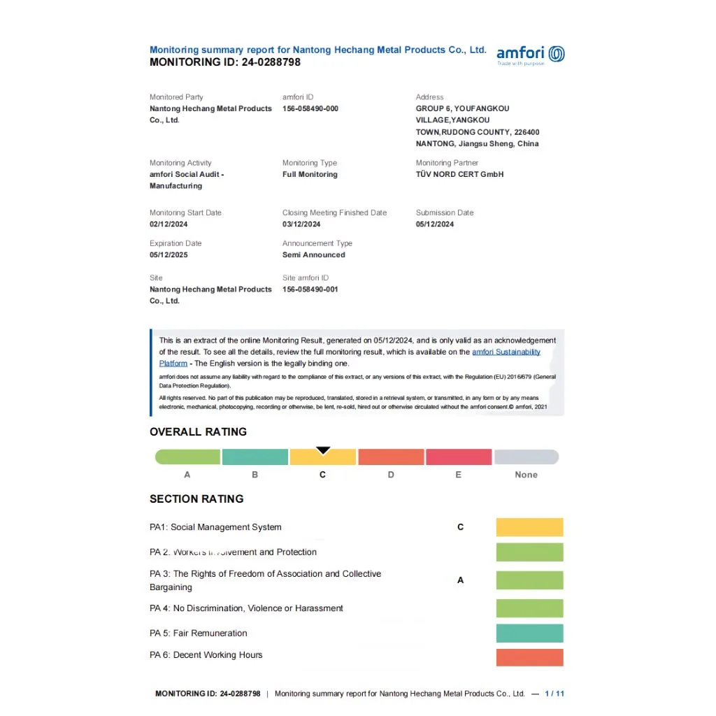 A Nantong Hechang fabrica cadeias de elos há mais de 20 anos e está empenhada na reforma e inovação da produção de cadeias, sendo a qualidade e o serviço o nosso principal objetivo. A nossa fábrica está equipada com linhas de produção avançadas e a qualidade dos nossos produtos está sempre alinhada com os padrões internacionais avançados. Passámos a certificação amfori (BSIC) e somos avaliados pela autoridade todos os anos.